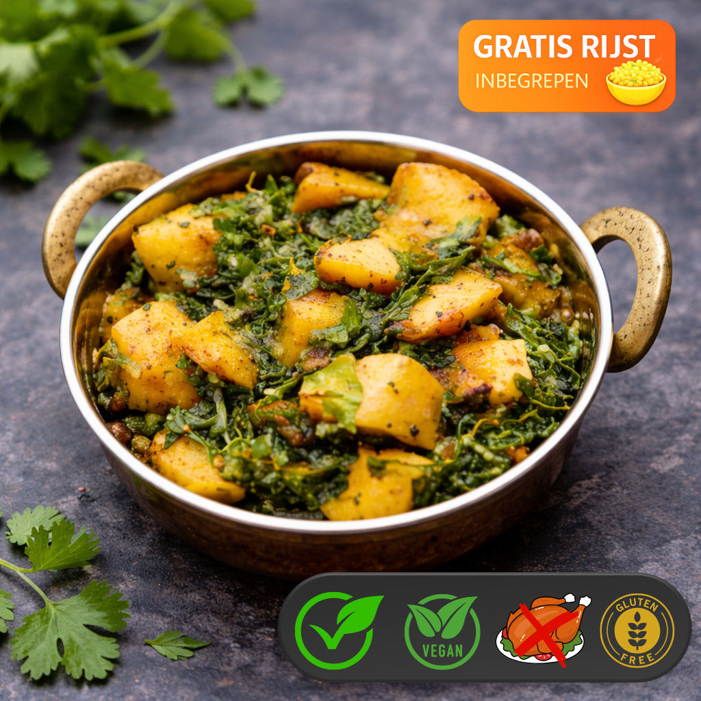 Saag Aloo is een traditioneel vegetarisch gerecht uit de Indiase keuken, bereid met zachte aardappelen (aloo) en verse spinazie (saag). Het gerecht wordt langzaam gekookt in een kruidige saus met aromatische specerijen zoals komijn, knoflook, gember en garam masala. Een smaakvol en voedzaam gerecht met een romige textuur, perfect geserveerd met rijst of naan.