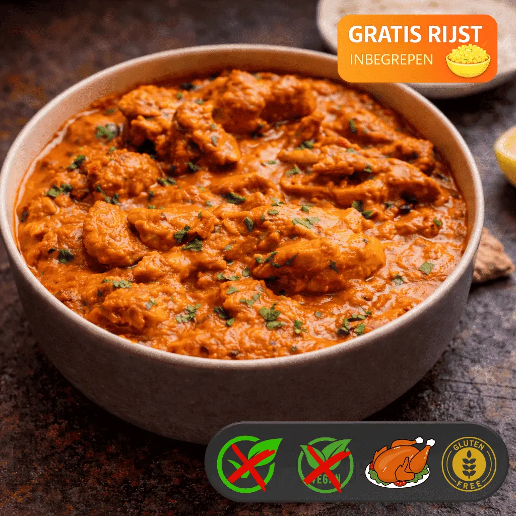 Butter Chicken is een bekend Indiaas gerecht bestaande uit gemarineerde en gegrilde stukjes kip, geserveerd in een romige tomaten-botersaus. De saus wordt bereid met tomaten, boter, room en een mix van kruiden en specerijen zoals garam masala, komijn, koriander, knoflook en gember. Het gerecht staat bekend om zijn rijke, zijdezachte textuur en milde, maar toch smaakvolle smaken. Het wordt geserveerd met rijst maar het is ook lekker met naanbrood.