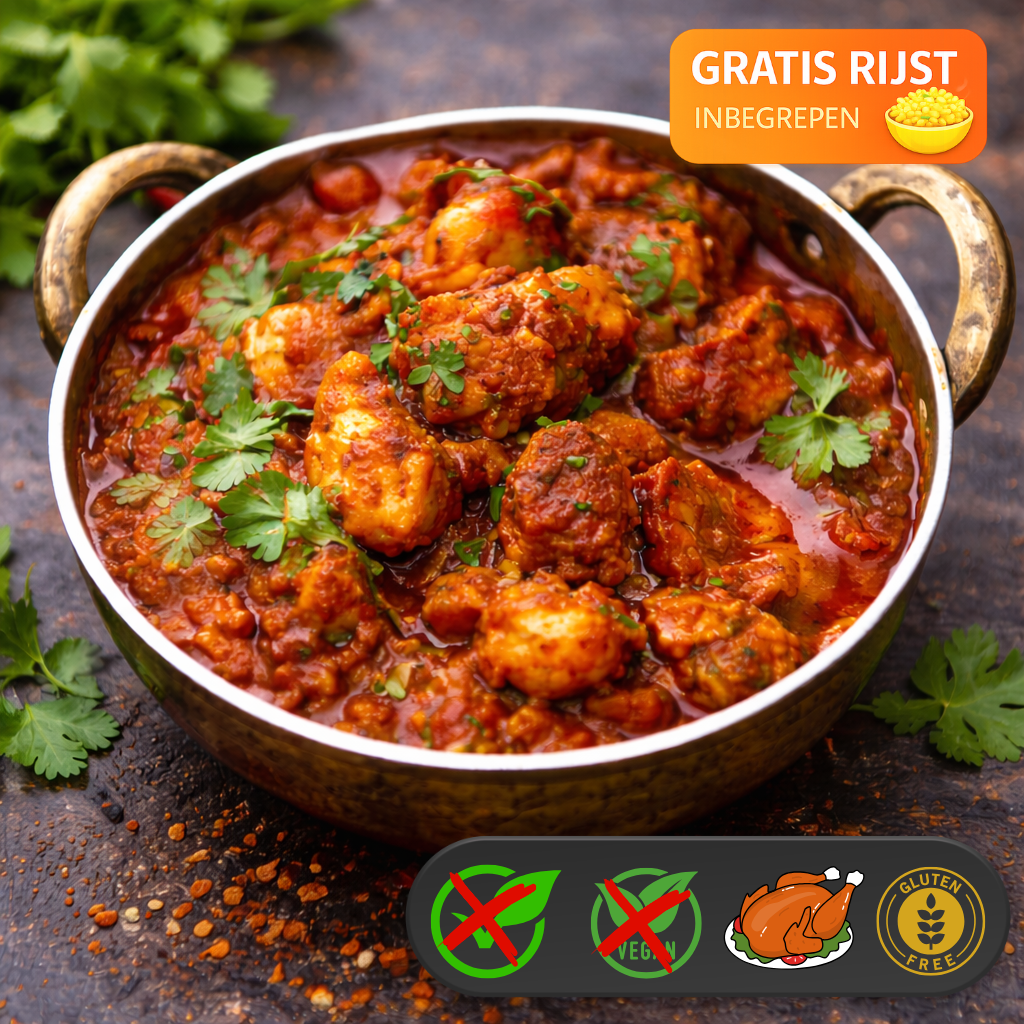 Chicken Madras is een pittig en smaakvol Indiaas gerecht afkomstig uit Zuid-India. Het wordt bereid met malse stukjes kip, langzaam gekookt in een kruidige tomatensaus met aromatische specerijen zoals komijn, koriander, knoflook, gember en rode chilipepers. Dit gerecht staat bekend om zijn intense en krachtige smaak en wordt traditioneel geserveerd met rijst.