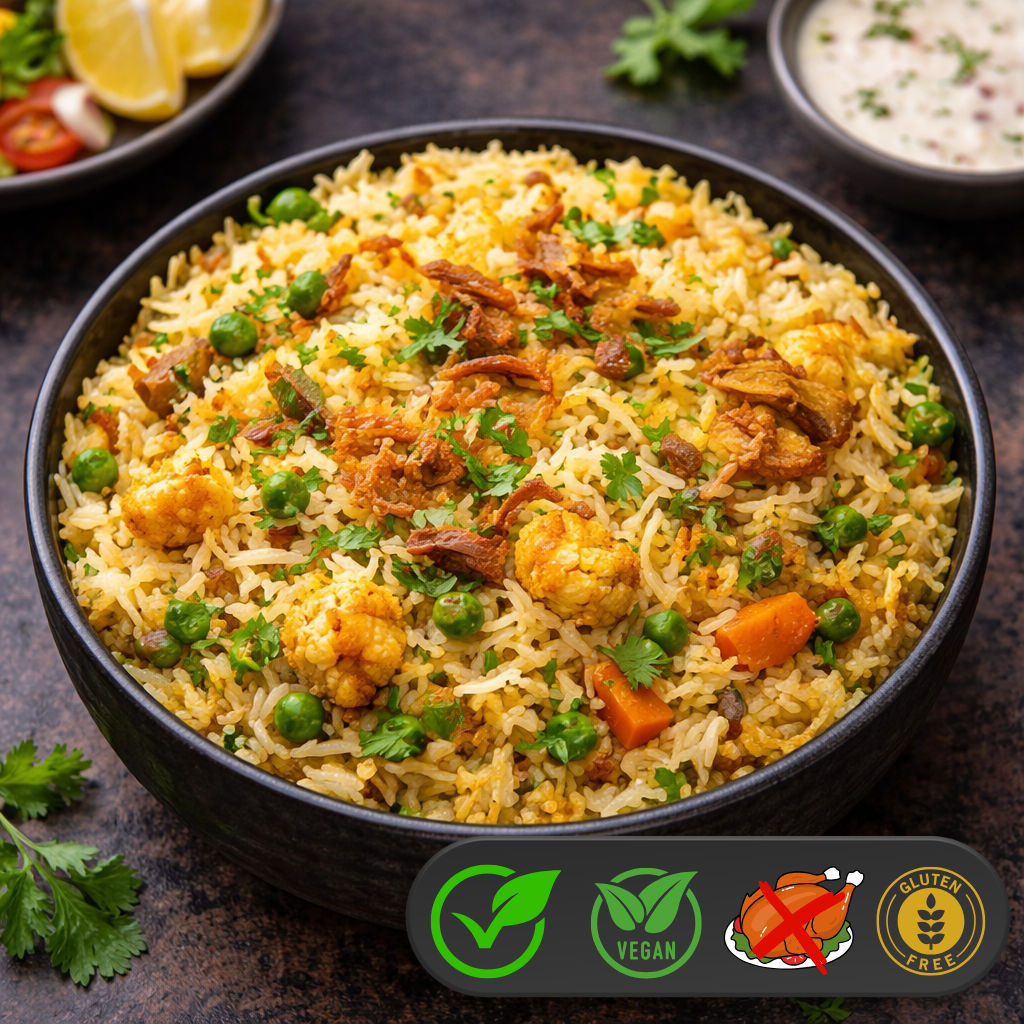 Vegetable Biryani is een rijstgerecht uit de Indiase keuken, bereid met een mix van gekookte groenten, basmatirijst en een mengsel van aromatische specerijen. Biryani heeft een rijke smaak en wordt geserveerd met raita (een yoghurtsaus) en salade. Het staat bekend om zijn aroma, smaak en verscheidenheid aan kruiden.